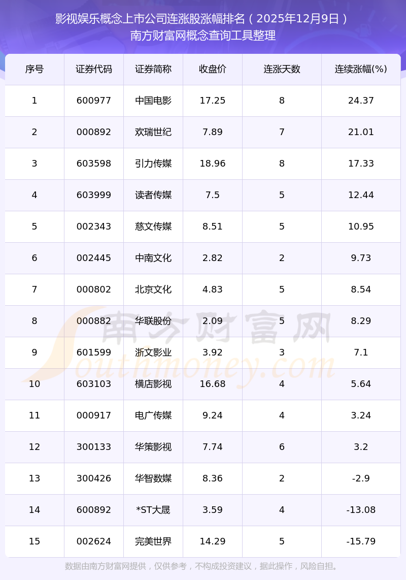 根據(jù)南方財(cái)富網(wǎng)概念查詢工具數(shù)據(jù)統(tǒng)計(jì),截止2025年12月9日收盤,影視娛樂概念上市公司共有15只個(gè)股實(shí)現(xiàn)連漲。其中連續(xù)漲幅較大的個(gè)股有中國電影、歡瑞世紀(jì)、引力傳媒等,連續(xù)漲幅分別為24.37%、21.01%、17.33%。