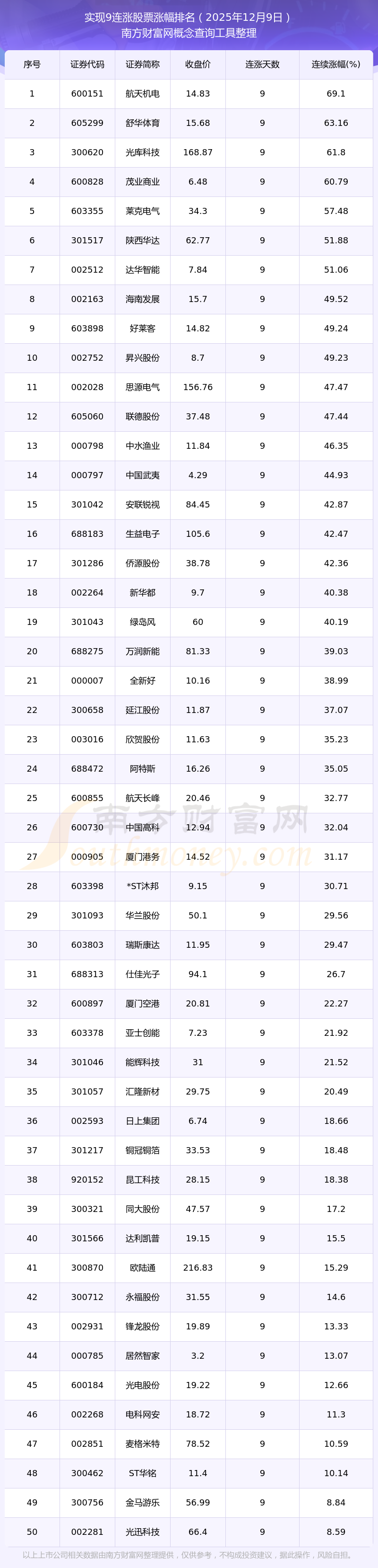 2025年12月9日實(shí)現(xiàn)9連漲股票漲幅排名
