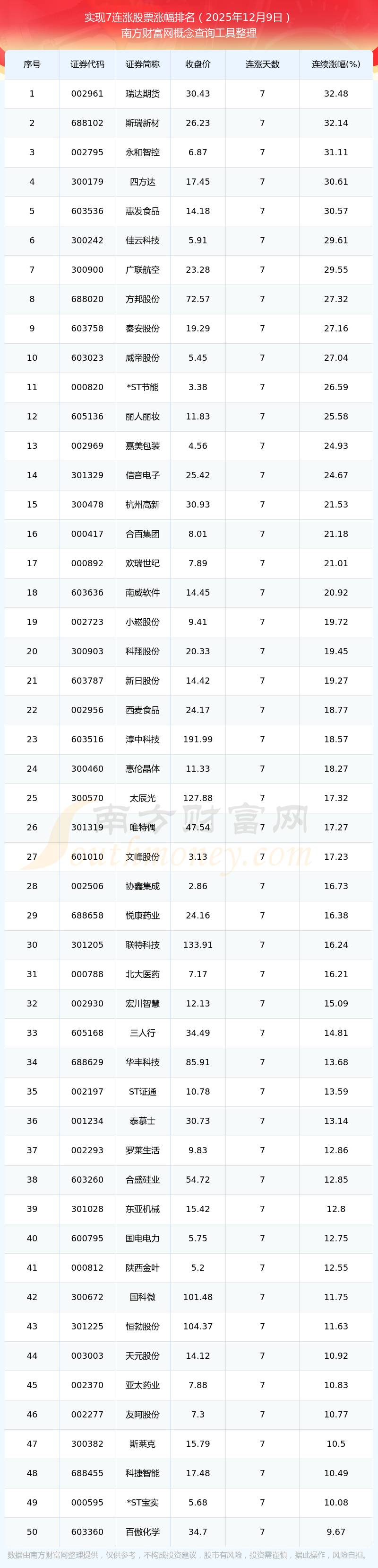 2025年12月9日實(shí)現(xiàn)7連漲股票漲幅排名