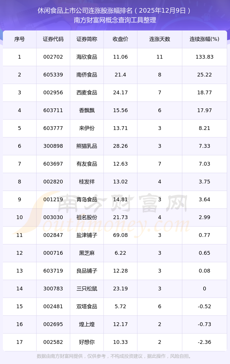 2025年12月9日休閑食品上市公司連漲股漲幅排名