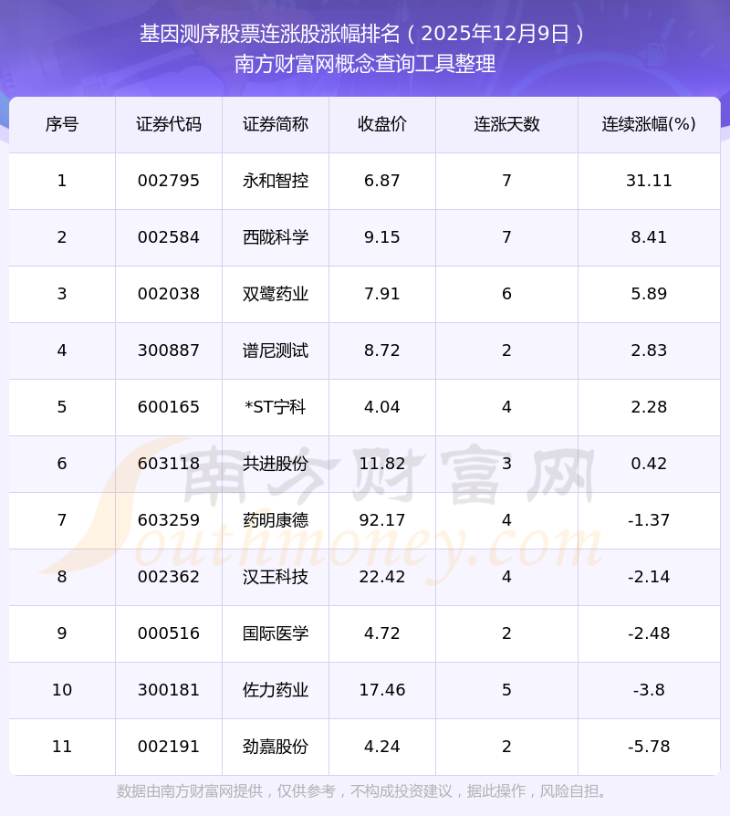 2025年12月9日基因測序股票連漲股漲幅排名