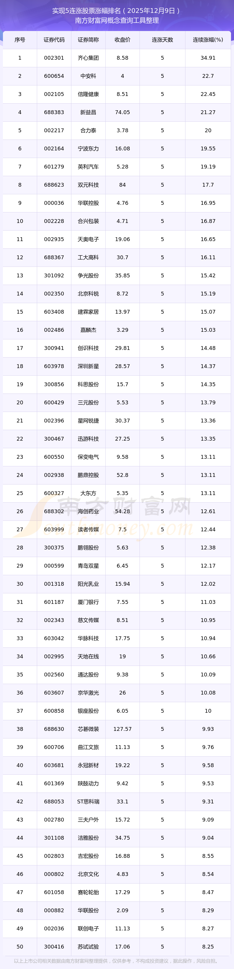 根據(jù)南方財(cái)富網(wǎng)概念查詢工具數(shù)據(jù)統(tǒng)計(jì),截止2025年12月9日收盤,共有148只個(gè)股實(shí)現(xiàn)5天連漲。其中連續(xù)漲幅較大的個(gè)股有齊心集團(tuán)、中安科、信隆健康等,連續(xù)漲幅分別為34.91%、22.70%、22.45%。