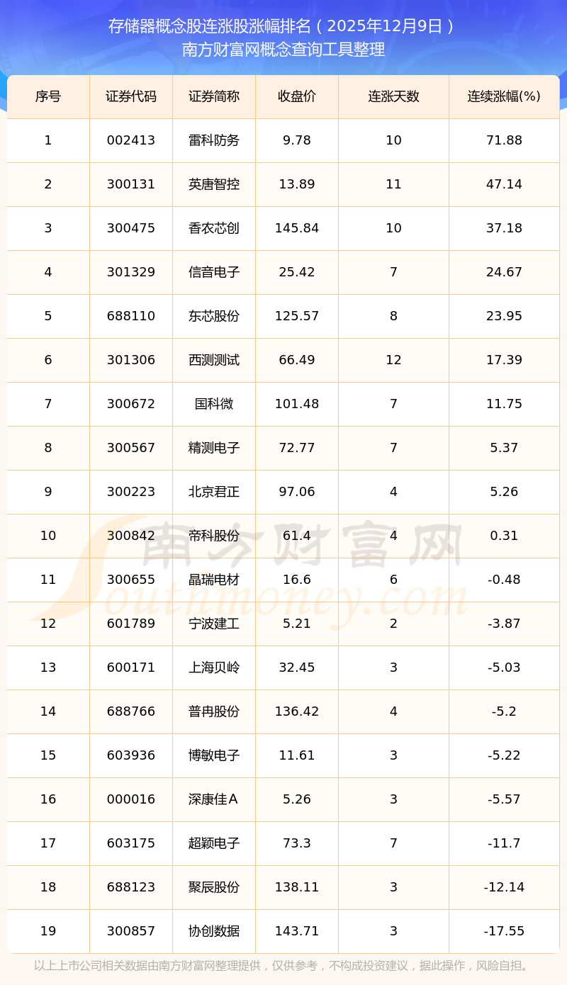 根據(jù)南方財(cái)富網(wǎng)概念查詢工具數(shù)據(jù)統(tǒng)計(jì),截止2025年12月9日收盤,存儲器概念股共有19只個股實(shí)現(xiàn)連漲。其中連續(xù)漲幅較大的個股有雷科防務(wù)、英唐智控、香農(nóng)芯創(chuàng)等,連續(xù)漲幅分別為71.88%、47.14%、37.18%。