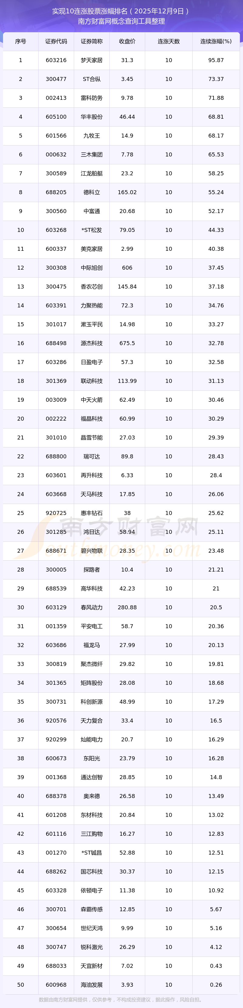 根據(jù)南方財(cái)富網(wǎng)概念查詢工具數(shù)據(jù)統(tǒng)計(jì),截止2025年12月9日收盤,共有51只個(gè)股實(shí)現(xiàn)10天連漲。其中連續(xù)漲幅較大的個(gè)股有夢天家居、ST合縱、雷科防務(wù)等,連續(xù)漲幅分別為95.87%、73.37%、71.88%。