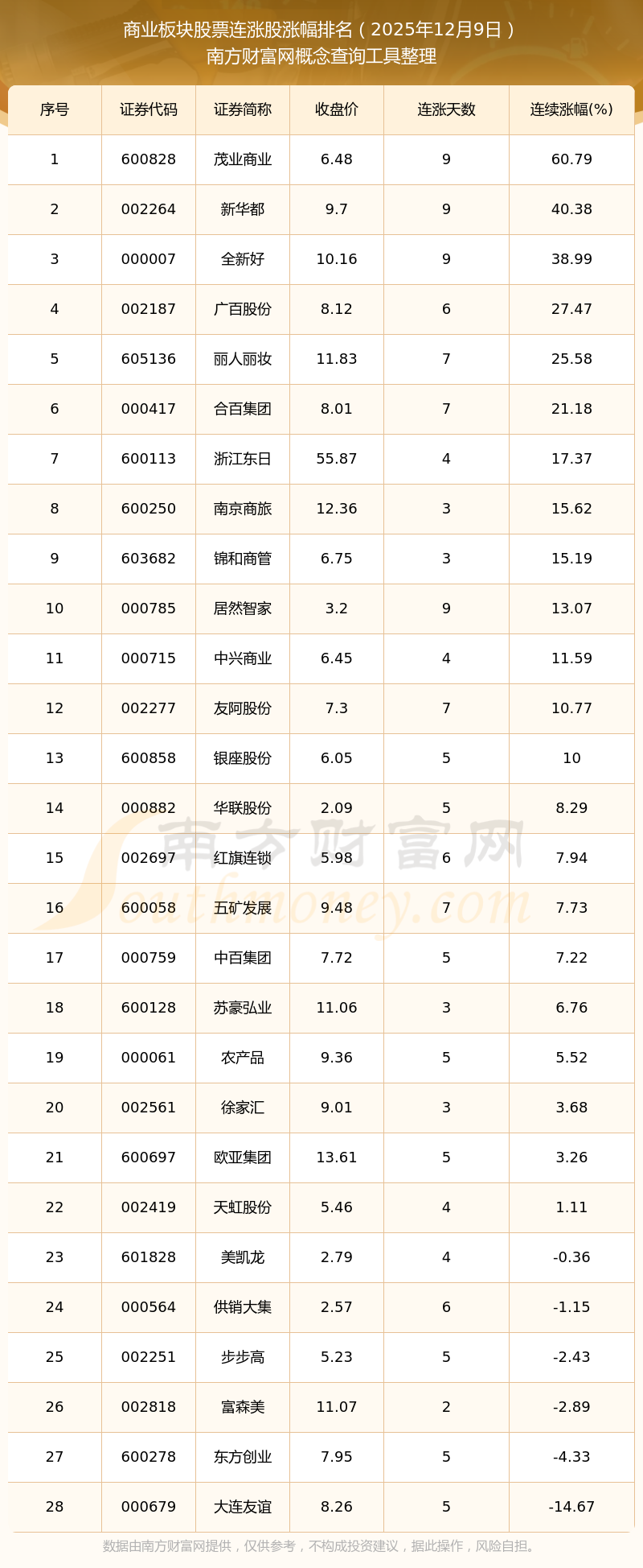 2025年12月9日商業(yè)板塊股票連漲股漲幅排名