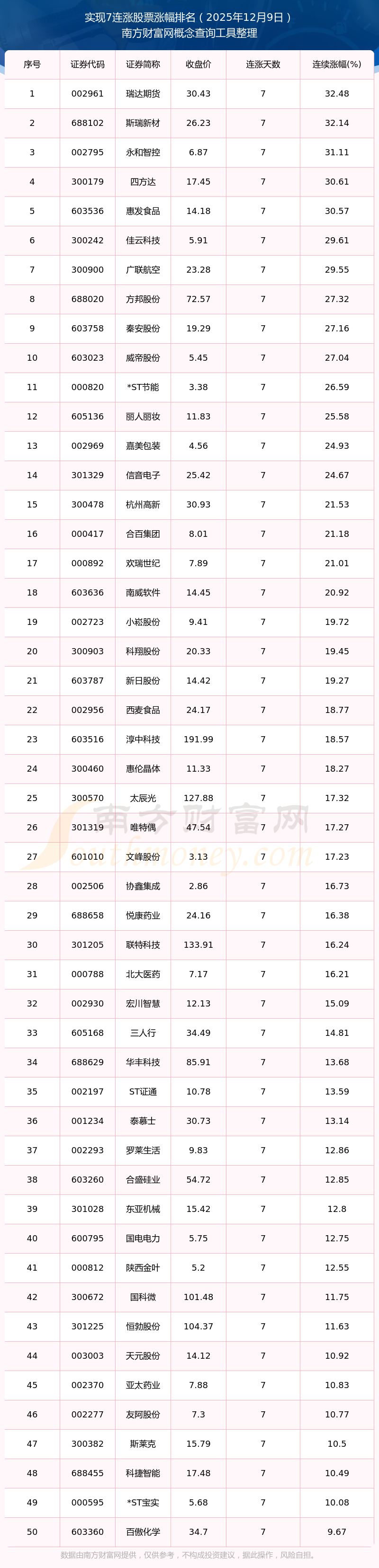 2025年12月9日實現(xiàn)7連漲股票漲幅排名