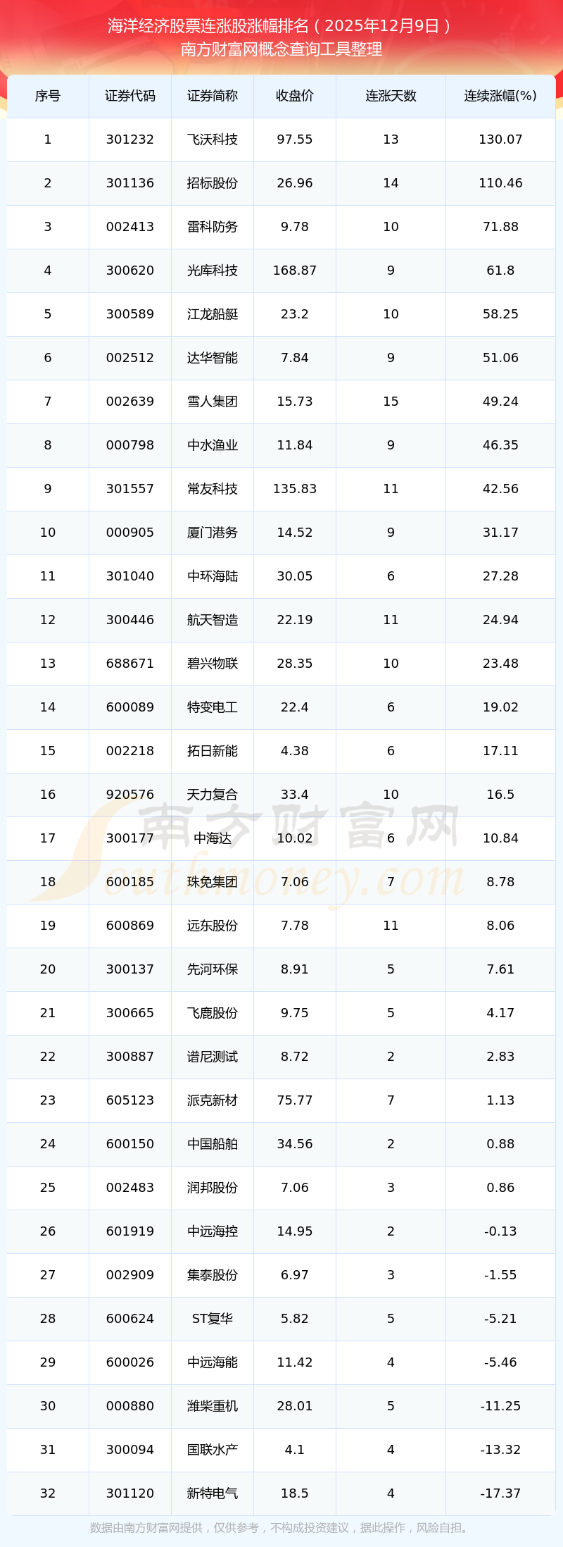 2025年12月9日海洋經(jīng)濟(jì)股票連漲股漲幅排名