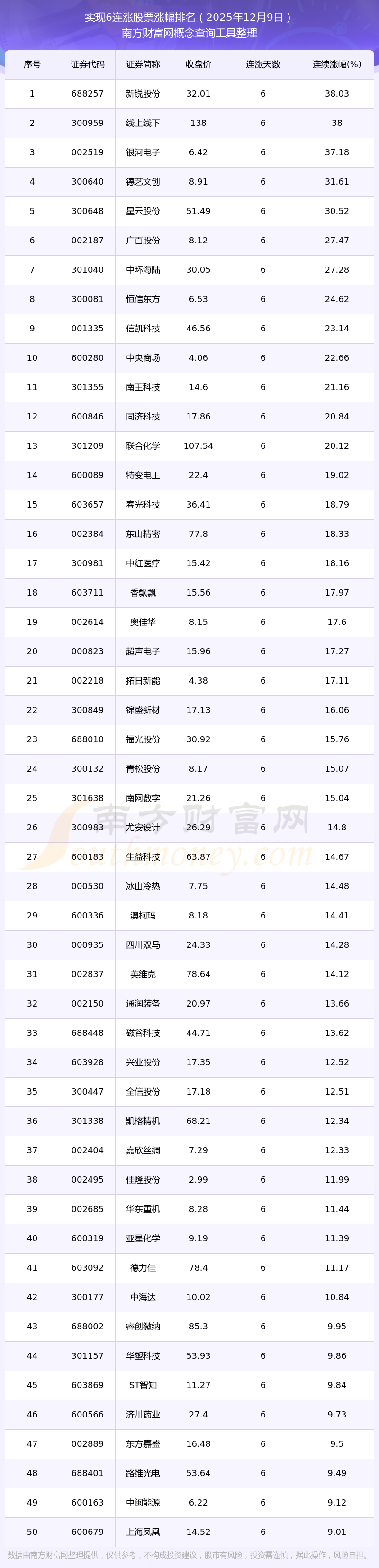2025年12月9日實(shí)現(xiàn)6連漲股票漲幅排名