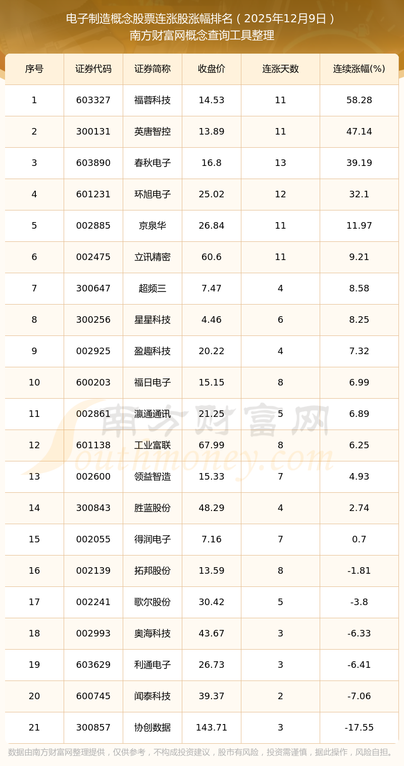 2025年12月9日電子制造概念股票連漲股漲幅排名