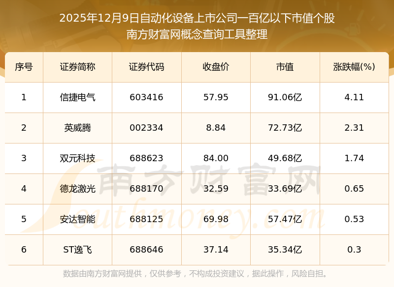 截止2025年12月9日,自動化設(shè)備上市公司市值一百億以下的個股共有6只。其中,市值較高的有信捷電氣、英威騰、安達(dá)智能,市值分別為91.06億元、72.73億元、57.47億元。