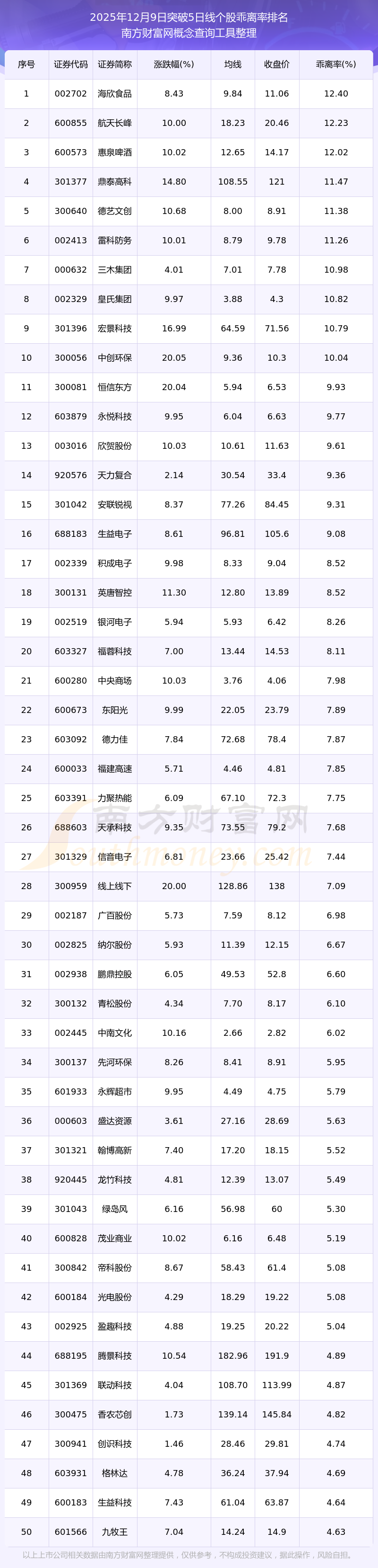 根據(jù)南方財富網(wǎng)概念查詢工具數(shù)據(jù)統(tǒng)計,截止2025年12月9日收盤,共有287只個股收盤價向上突破了5日線,其中乖離率較大的個股有海欣食品、航天長峰、惠泉啤酒、鼎泰高科、德藝文創(chuàng)等,乖離率分別為12.40%、12.23%、12.02%、11.47%、11.38%。