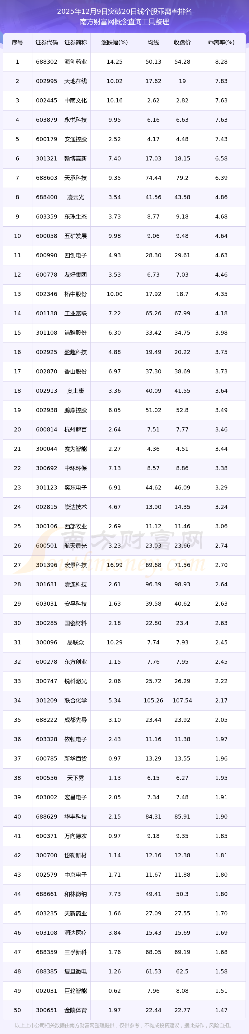 2025年12月9日突破20日線(xiàn)個(gè)股乖離率排名