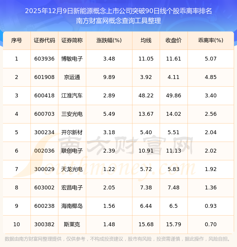 2025年12月9日新能源概念上市公司突破90日線個(gè)股乖離率排名