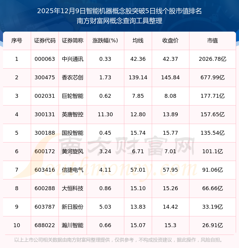 2025年12月9日智能機(jī)器概念股突破5日線個(gè)股市值排名