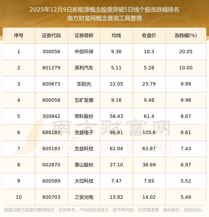 2025年12月9日新能源概念股票突破5日線個(gè)股漲跌幅排名