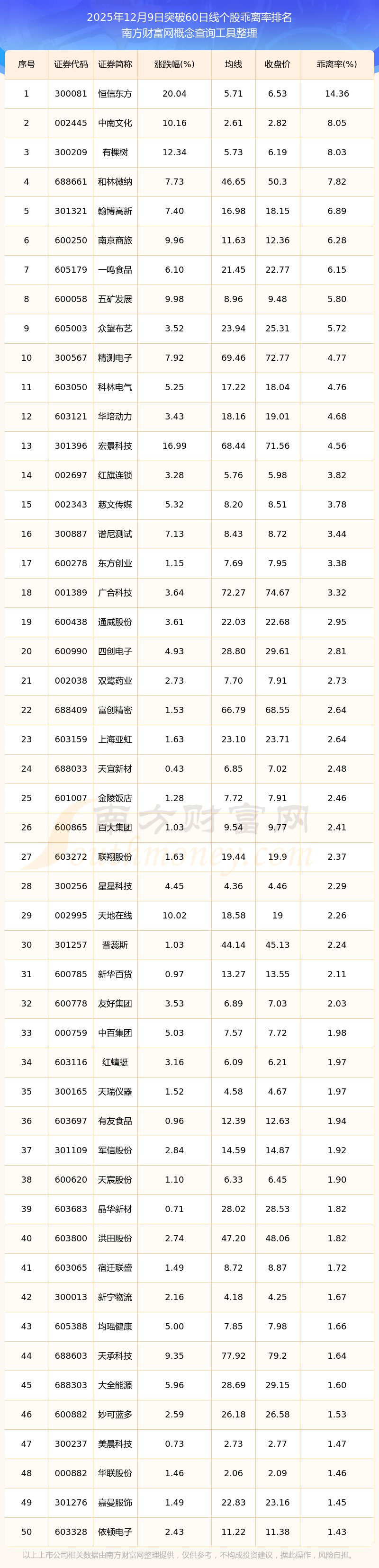 根據(jù)南方財(cái)富網(wǎng)概念查詢工具數(shù)據(jù)統(tǒng)計(jì),截止2025年12月9日收盤,共有86只個(gè)股收盤價(jià)向上突破了60日線,其中乖離率較大的個(gè)股有恒信東方、中南文化、有棵樹、和林微納、翰博高新等,乖離率分別為14.36%、8.05%、8.03%、7.82%、6.89%。