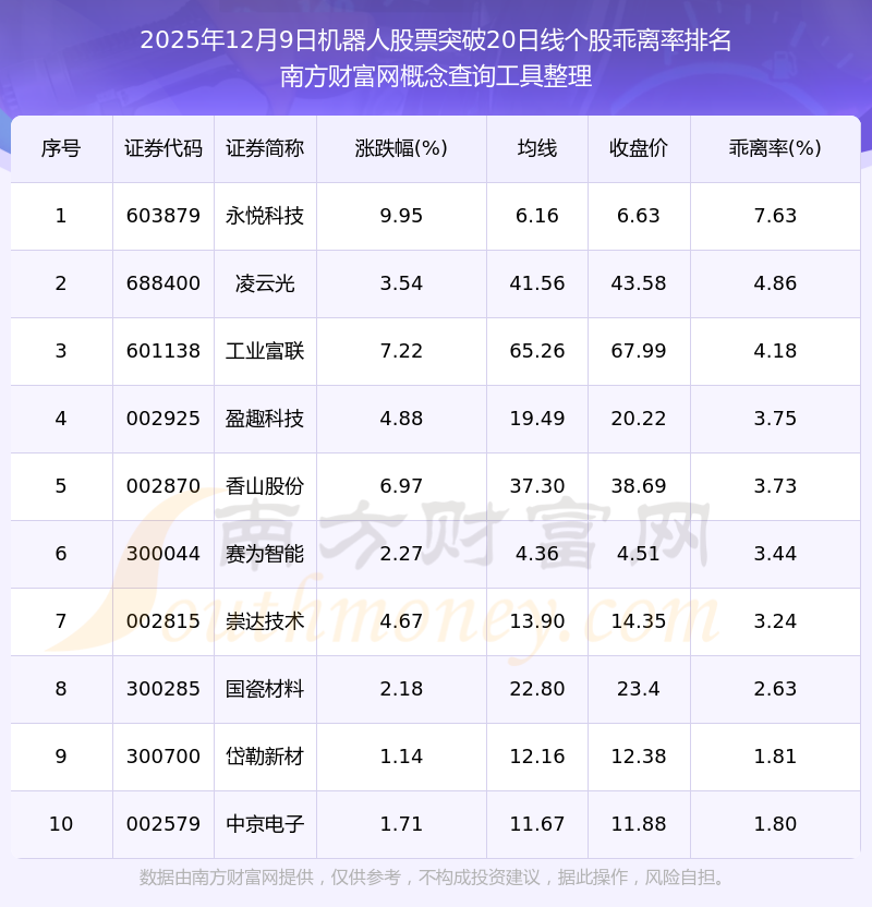 根據(jù)南方財富網(wǎng)概念查詢工具數(shù)據(jù)統(tǒng)計,截止2025年12月9日收盤,機器人股票共有24只個股收盤價向上突破了20日線。其中乖離率較大的個股有永悅科技、凌云光、工業(yè)富聯(lián)等,乖離率分別為7.63%、4.86%、4.18%。