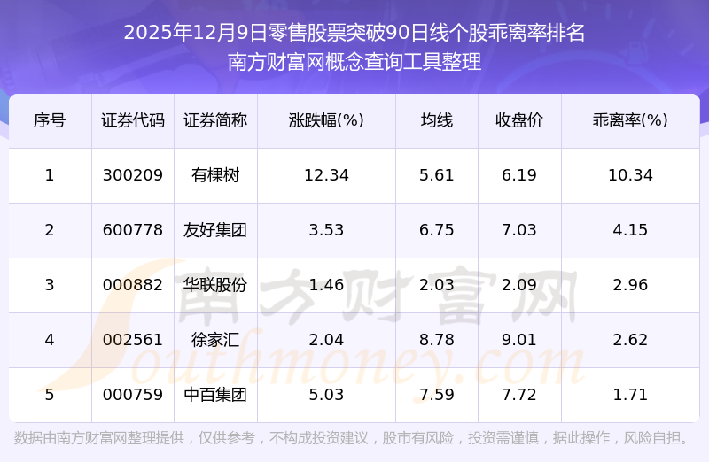 根據(jù)南方財富網(wǎng)概念查詢工具數(shù)據(jù)統(tǒng)計,截止2025年12月9日收盤,零售股票共有5只個股收盤價向上突破了90日線。其中乖離率較大的個股有有棵樹、友好集團(tuán)、華聯(lián)股份等,乖離率分別為10.34%、4.15%、2.96%。