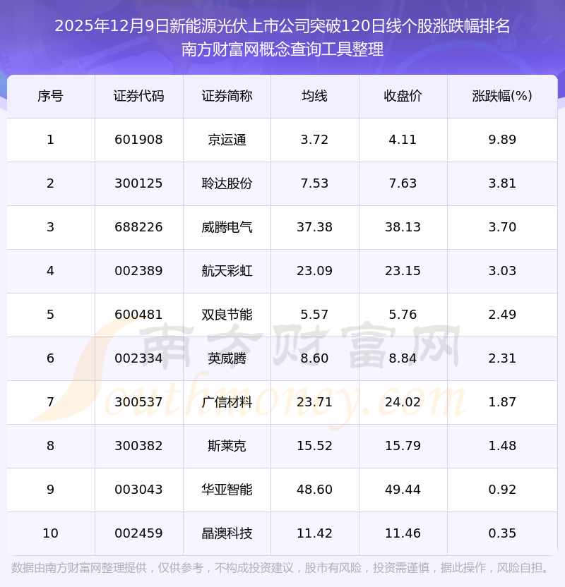2025年12月9日新能源光伏上市公司突破120日線個股漲跌幅排名