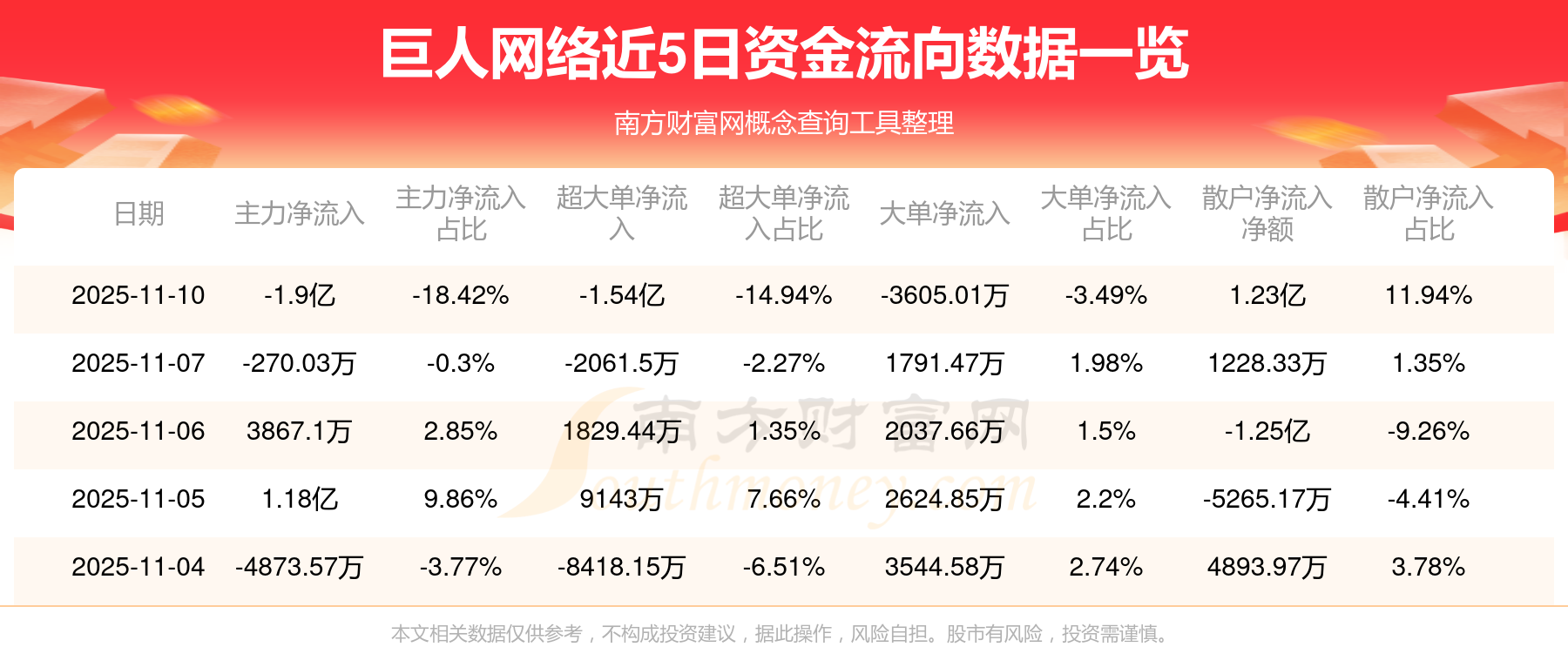 11月10日消息,巨人網(wǎng)絡(luò)11月10日主力資金凈流出1.9億元,超大單資金凈流出1.54億元,大單資金凈流出3605.01萬元,散戶資金凈流入1.23億元。