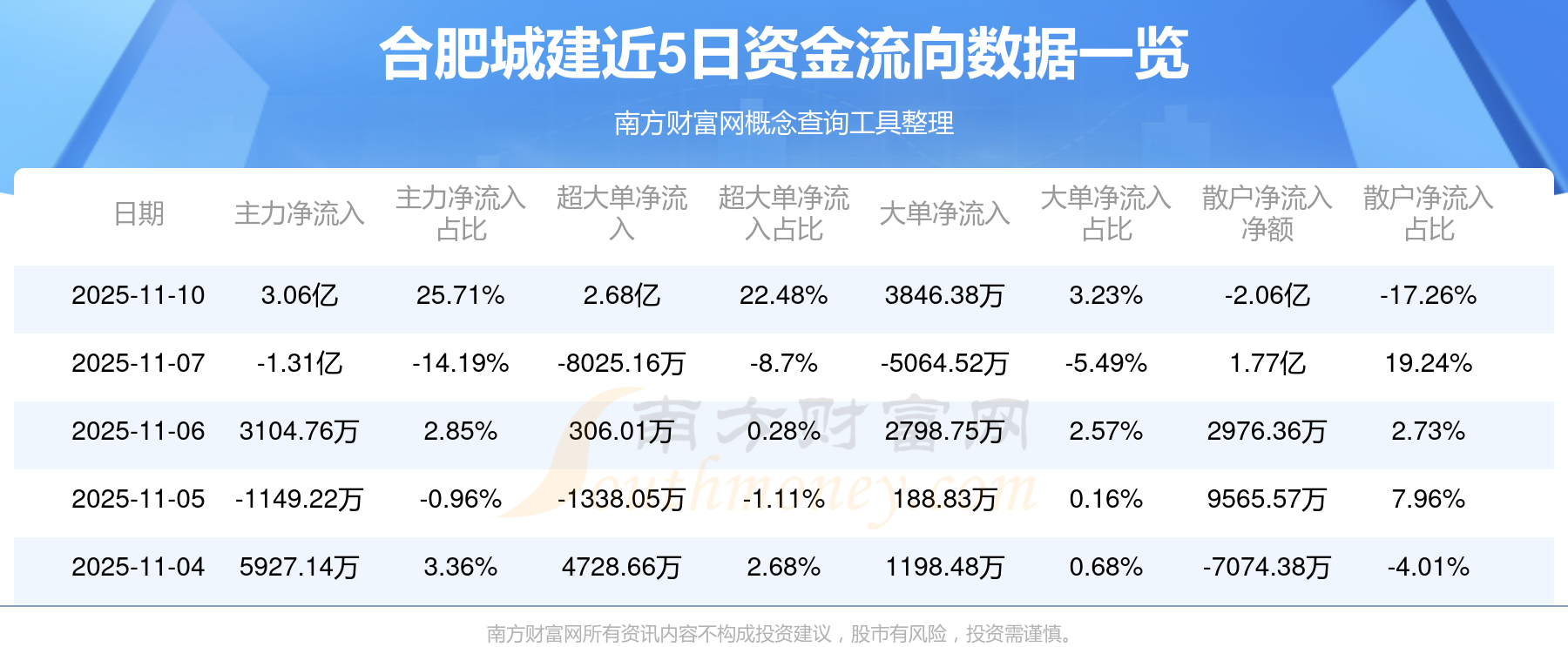 11月10日消息,合肥城建資金凈流入3.06億元,超大單資金凈流入2.68億元,換手率10.07%,成交金額10.11億元。