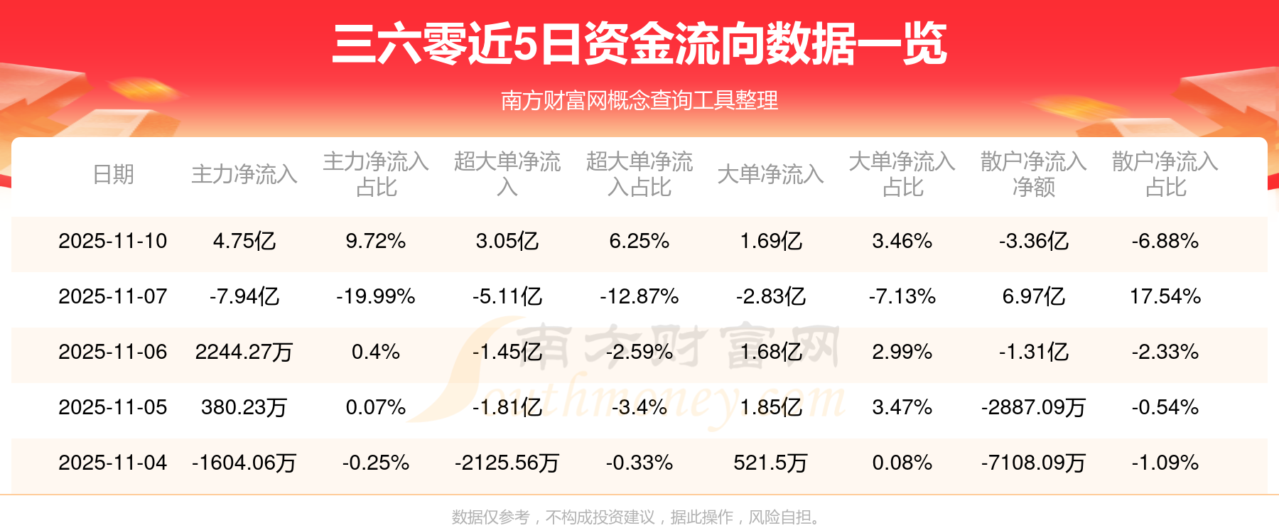 11月10日消息,三六零主力資金凈流入4.75億元,超大單資金凈流入3.05億元,散戶資金凈流出3.36億元。