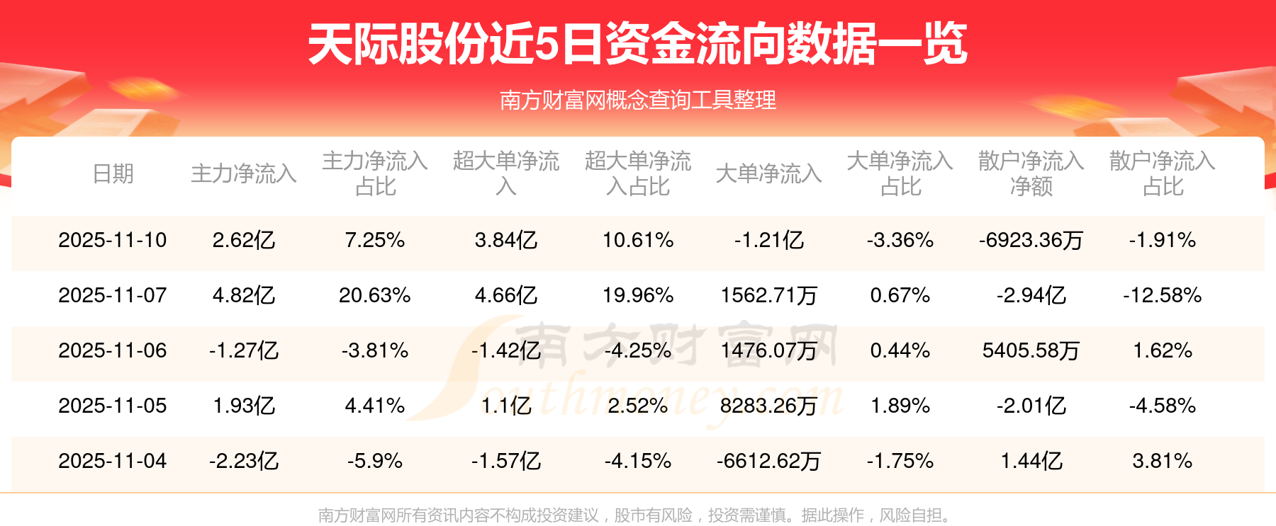 11月10日該股主力凈流入2.62億元,超大單凈流入3.84億元,大單凈流出1.21億元,中單凈流出1.93億元,散戶凈流出6923.36萬元。