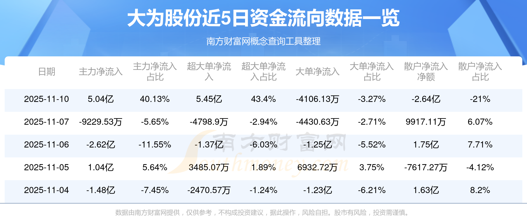 11月10日消息,大為股份11月10日主力凈流入5.04億元,超大單凈流入5.45億元,大單凈流出4106.13萬元,散戶凈流出2.64億元。