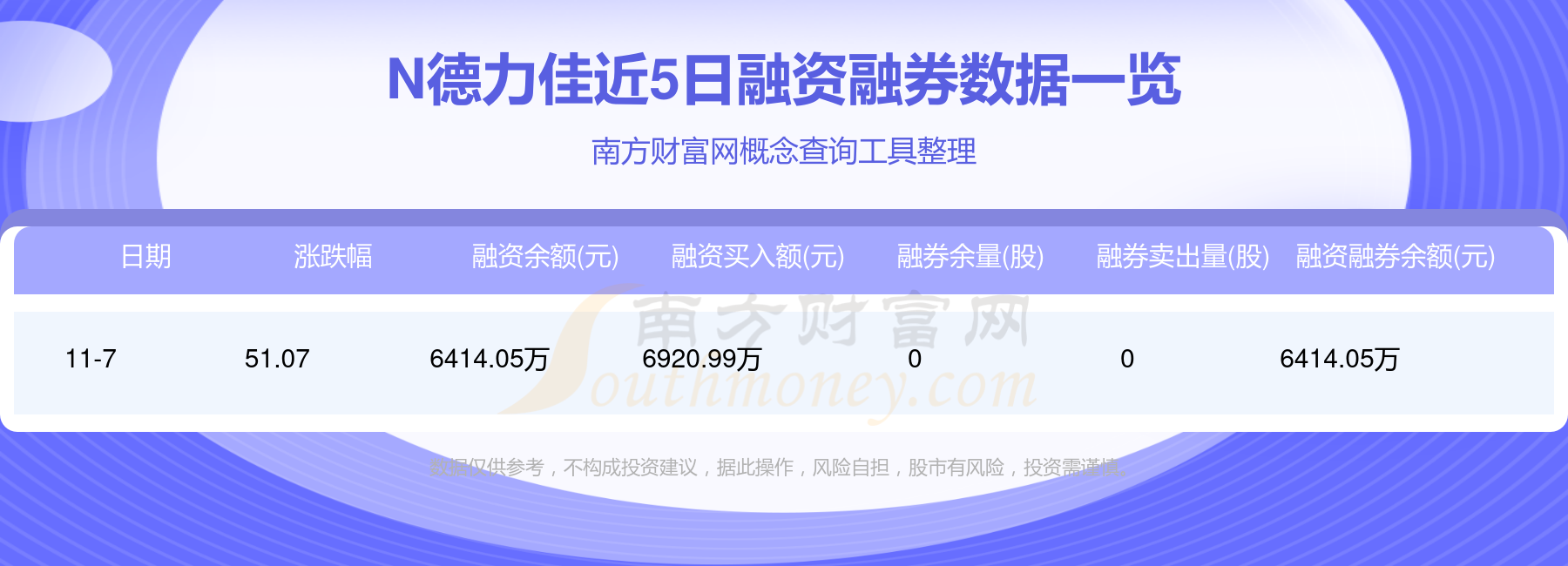 N德力佳11月7日融券信息顯示,融資方面,當日融資買入6920.99萬元,融資償還506.94萬元,融資凈買額6414.05萬元。近5日融資融券數(shù)據(jù)一覽見下表: