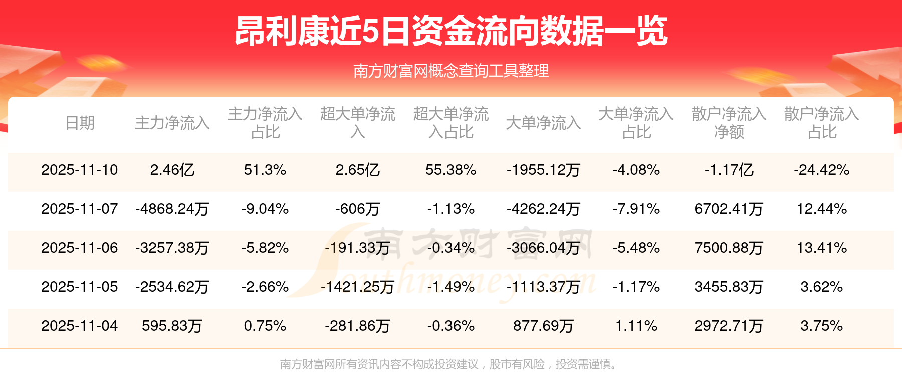 11月10日消息,昂利康資金凈流入2.46億元,超大單資金凈流入2.65億元,換手率14.17%,成交金額10.95億元。