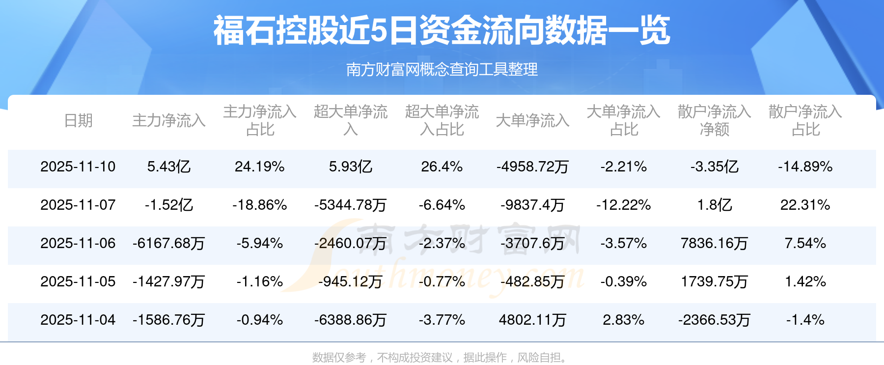11月10日消息,福石控股資金凈流入5.43億元,超大單資金凈流入5.93億元,換手率20.55%,成交金額11.42億元。