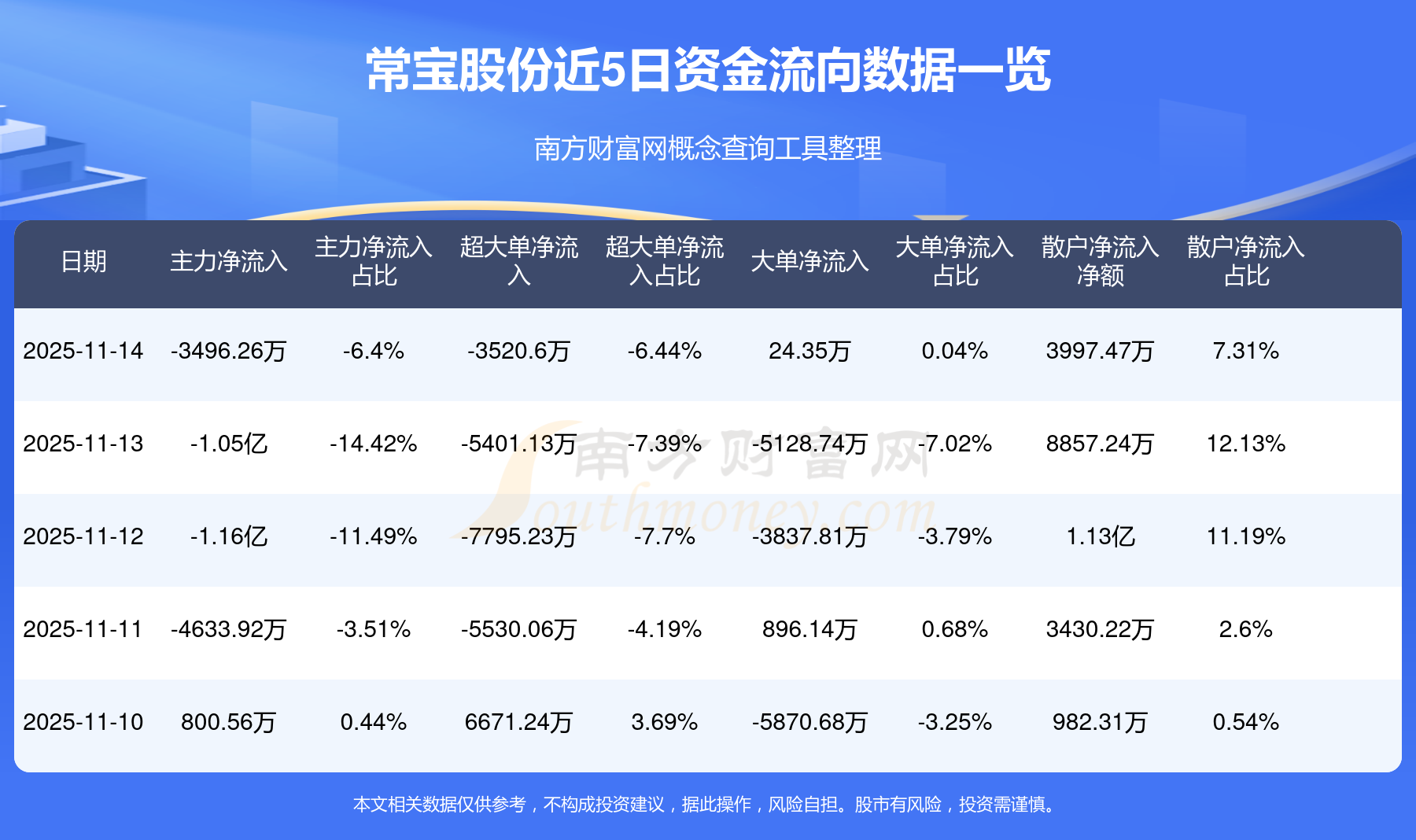 11月14日消息,常寶股份主力凈流出3496.26萬元,超大單凈流出3520.6萬元,散戶凈流入3997.47萬元。