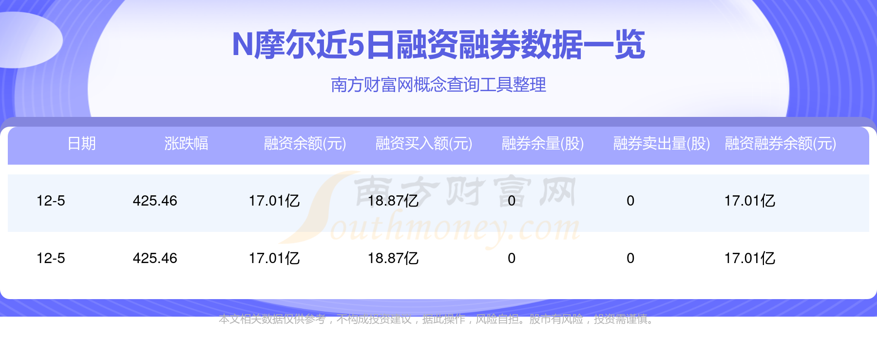 12月5日N摩爾融券信息顯示,融資方面,當日融資買入18.87億元,融資償還1.86億元,融資凈買額17.01億元。近5日融資融券數(shù)據(jù)一覽見下表: