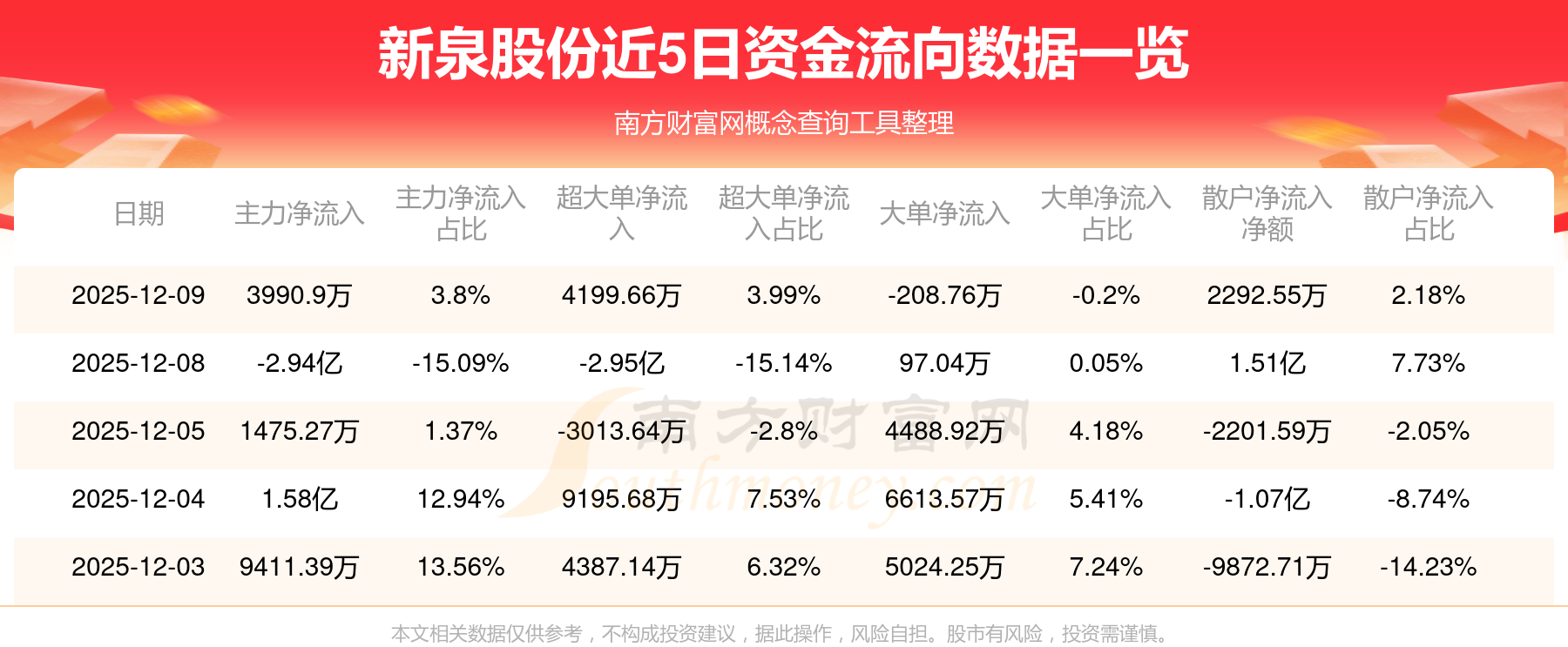 12月9日消息,新泉股份主力凈流入3990.9萬元,超大單凈流入4199.66萬元,散戶凈流入2292.55萬元。