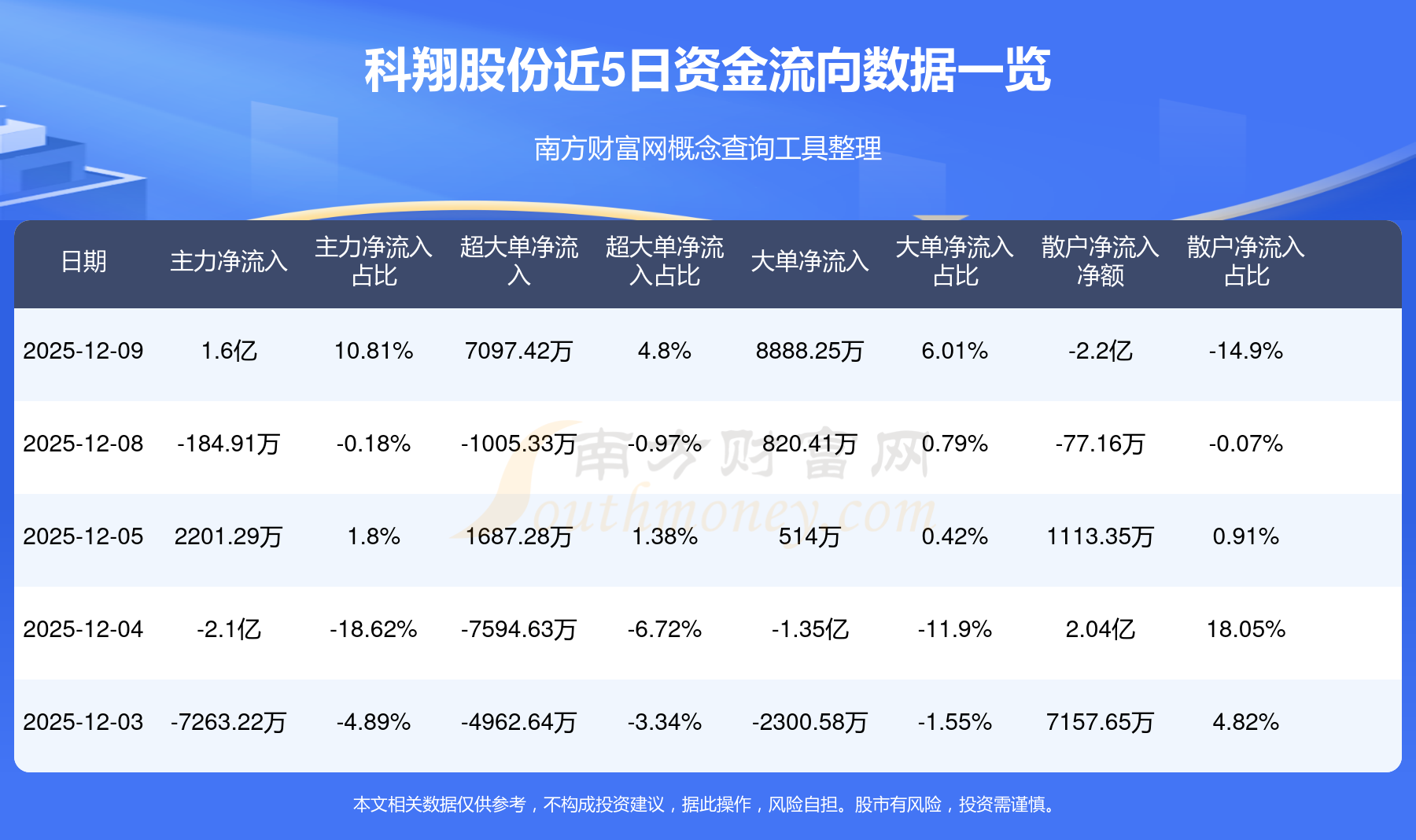 12月9日消息,科翔股份12月9日主力凈流入1.6億元,超大單凈流入7097.42萬元,大單凈流入8888.25萬元,散戶凈流出2.2億元。