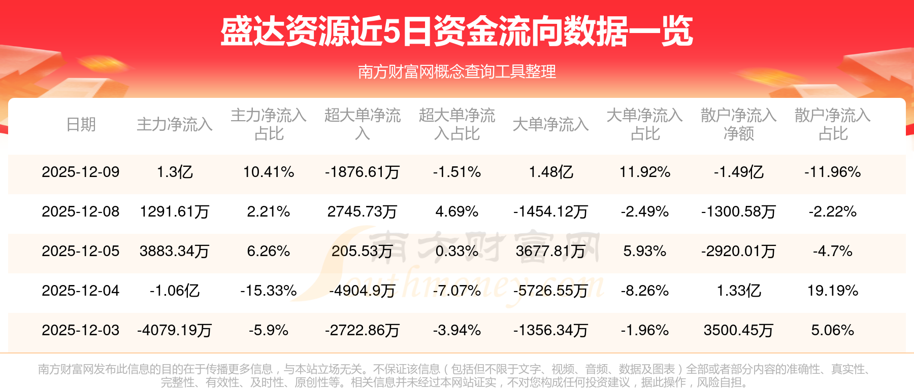 12月9日消息,盛達資源主力資金凈流入1.3億元,超大單資金凈流出1876.61萬元,散戶資金凈流出1.49億元。