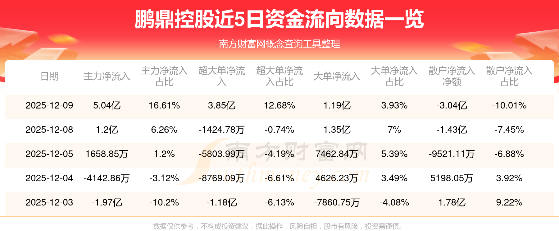 12月9日該股主力凈流入5.04億元,超大單凈流入3.85億元,大單凈流入1.19億元,中單凈流出2億元,散戶凈流出3.04億元。