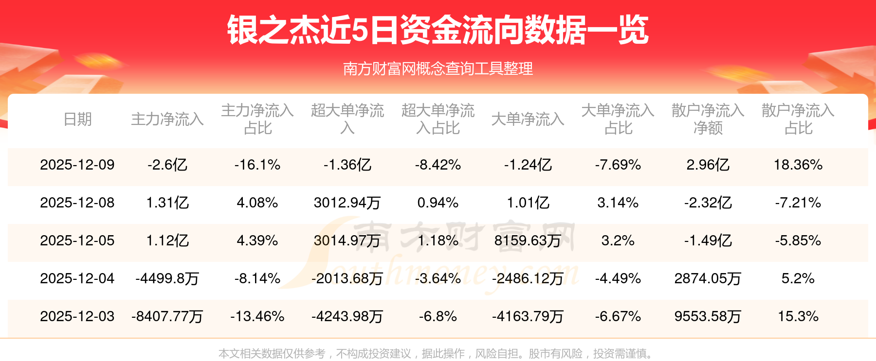 12月9日消息,銀之杰12月9日主力凈流出2.6億元,超大單凈流出1.36億元,大單凈流出1.24億元,散戶(hù)凈流入2.96億元。