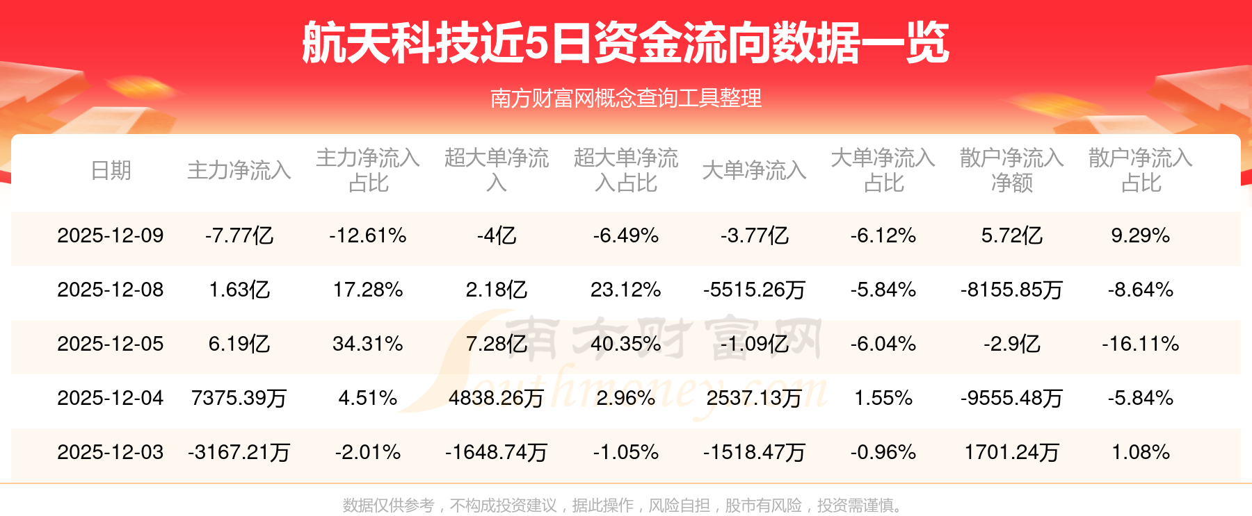 12月9日消息,航天科技資金凈流出7.77億元,超大單資金凈流出4億元,換手率31.53%,成交金額61.58億元。