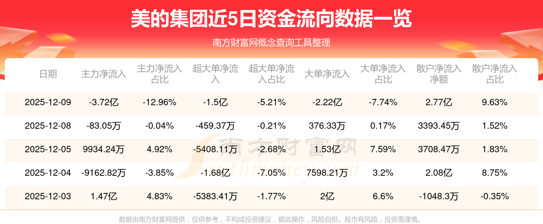 12月9日消息,美的集團(tuán)資金凈流出3.72億元,超大單凈流出1.5億元,換手率0.51%,成交金額28.73億元。