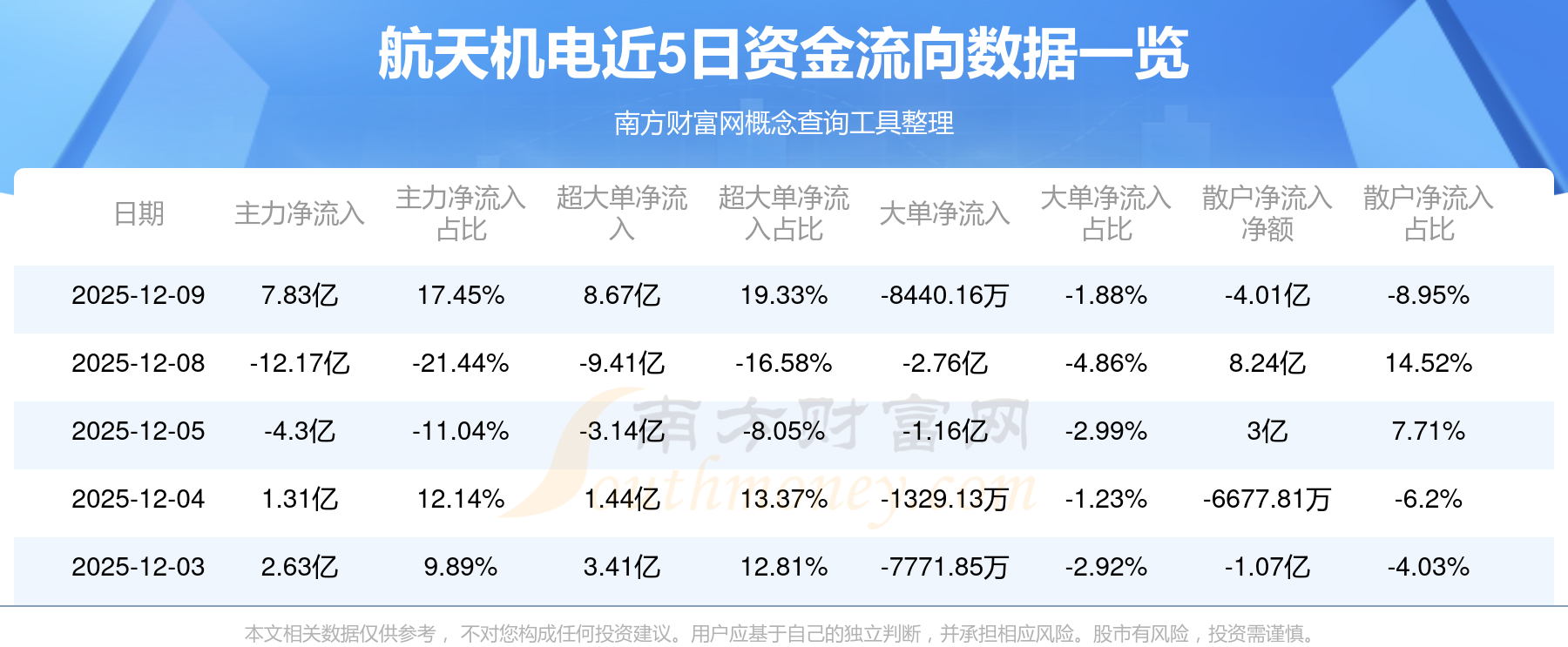 12月9日消息,航天機電12月9日主力資金凈流入7.83億元,超大單資金凈流入8.67億元,大單資金凈流出8440.16萬元,散戶資金凈流出4.01億元。