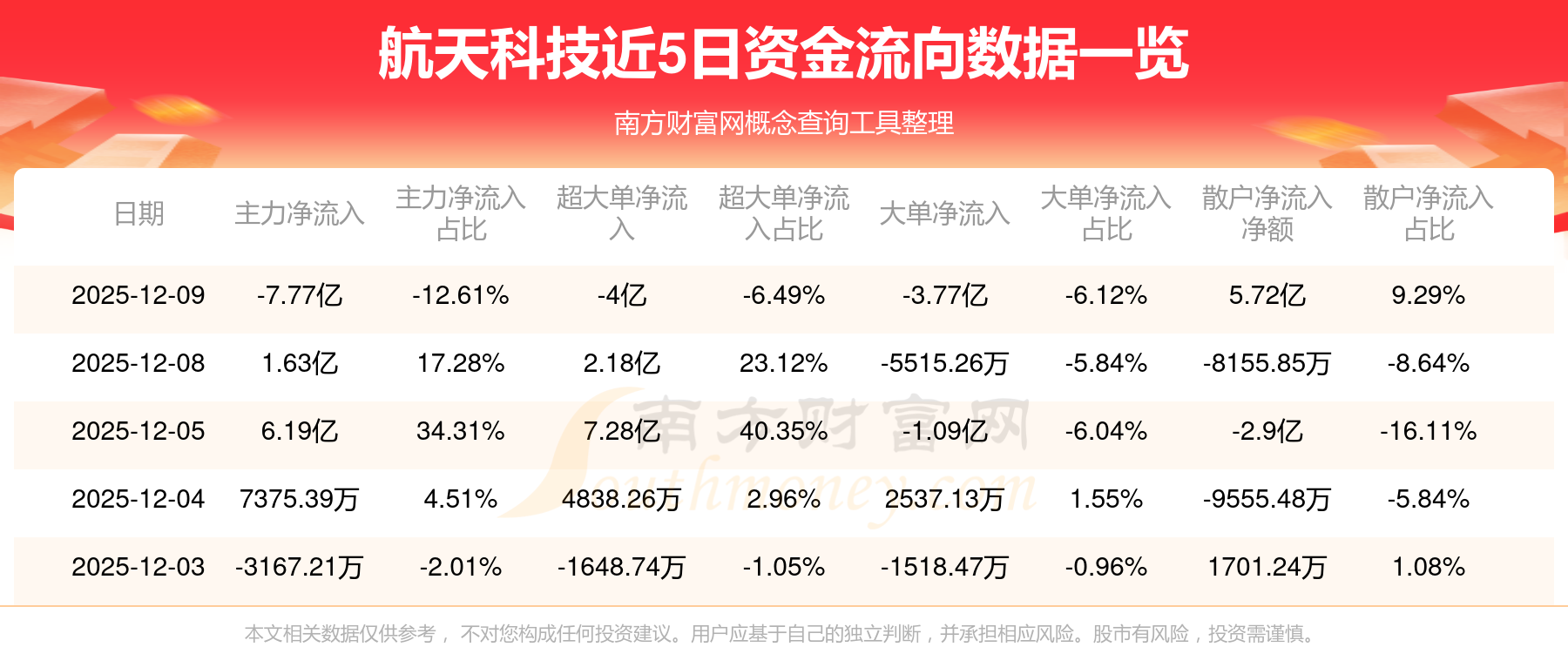 12月9日消息,航天科技資金凈流出7.77億元,超大單資金凈流出4億元,換手率31.53%,成交金額61.58億元。