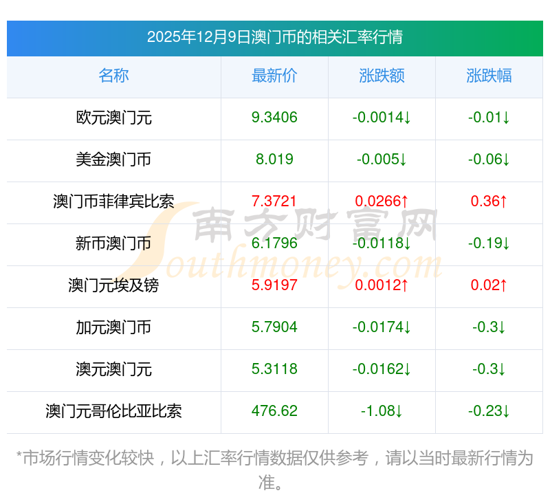 2025年12月9日澳門幣相關(guān)匯率查詢