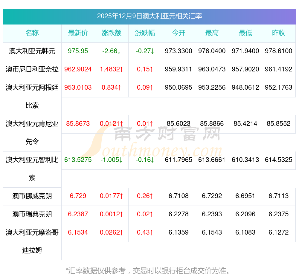2025年12月9日澳大利亞元相關(guān)匯率查詢