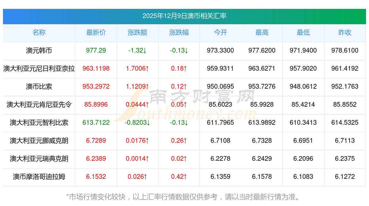 2025年12月9日澳幣相關(guān)匯率查詢