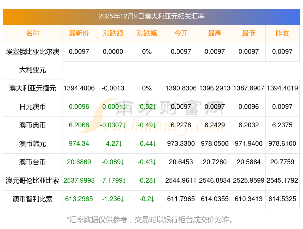 2025年12月9日澳大利亞元相關(guān)匯率查詢