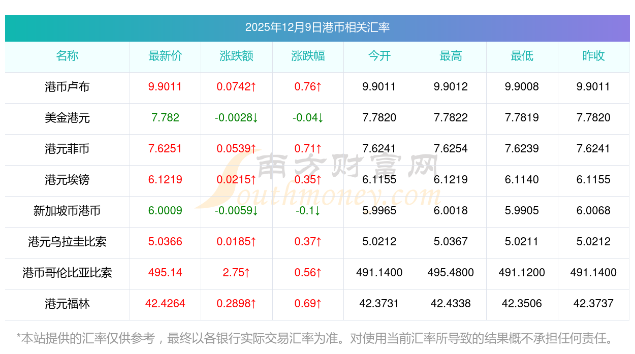 根據(jù)2025年12月9日匯率,港幣兌換哥倫比亞比索匯率最新價495.140000,今開價491.1400,昨收價491.1400,最高價495.4800,最低價491.1200。