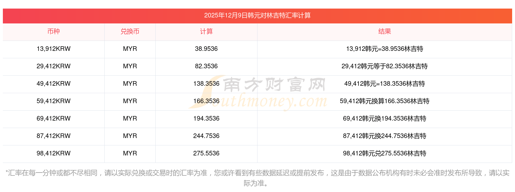 匯率實(shí)時更新!66韓元兌換林吉特匯率表(2025年12月9日)