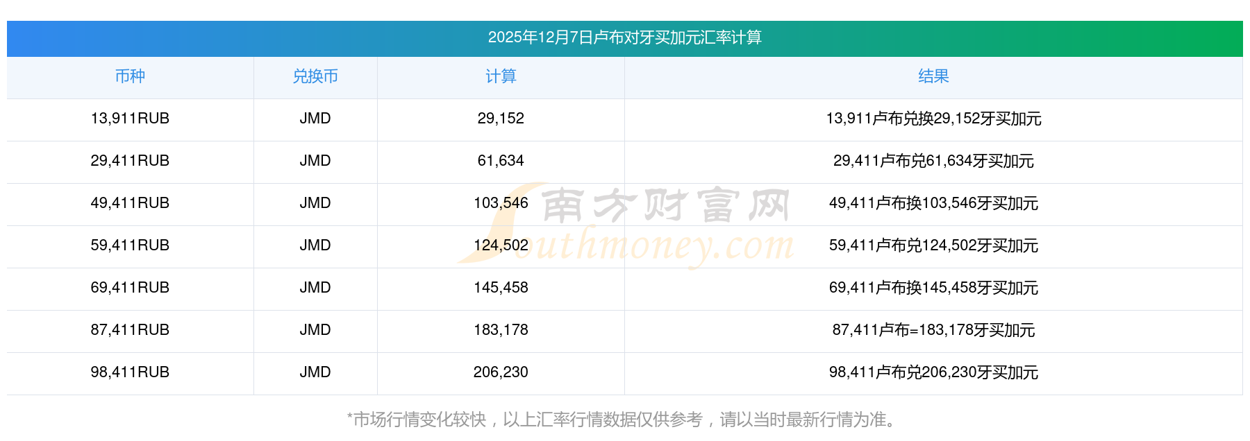南方財富網(wǎng)為您提供盧布對牙買加元匯率最新價格詳情。
