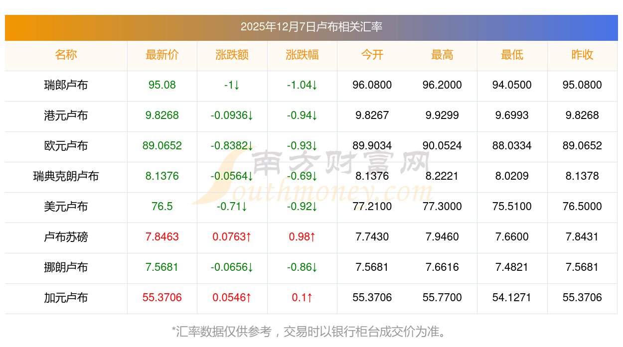 根據(jù)2025年12月7日匯率,盧布兌換利比里亞元匯率最新2.307200,今開2.3072,昨收2.3072,最高2.3308,最低2.2795。